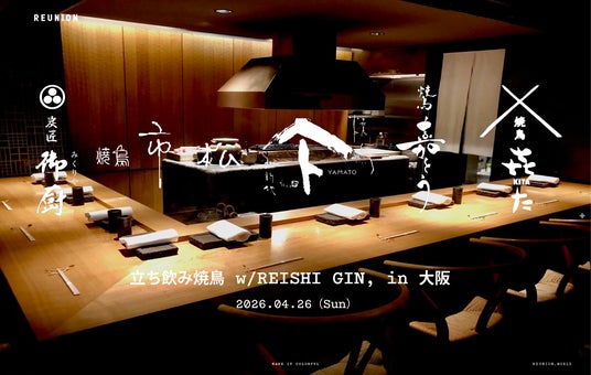 地球と人にやさしいウェルネスブランドREUNION(株式会社WWWE、東京都渋谷区)が展開する食中酒のニュースタンダード「REISHI GIN,」は、2026年4月22日(水)のアースデイ(地球の日)に3周年を迎えます。4年目となる今年は、昨年多くの来場者を集めた、名店の焼鳥を一度にカジュアルに楽しめる立ち飲みスタイルのPOPUPイベント「立ち飲み焼鳥 w/REISHI GIN,」を全国へ展開。全国各地を代表する焼鳥店とともに、地域ごとの焼鳥の魅力を発信しながら、珠玉の焼鳥とREISHI GIN,のペアリングを堪能できる唯一無二の焼鳥体験を提供します。今年最初の開催となる第三弾は、2026年4月26日(日)に関西初となる大阪での開催が決定。大阪の炭匠 御厨、焼鳥 市松、焼鳥YAMATOに加え、東京から焼鳥 嘉とう、焼鳥 喜た(KITA)が参加し、ミシュランガイド掲載店を含む名店5店舗が集結します。