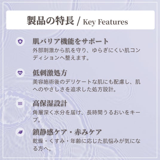 美容医療施術後の肌状態を想定した、POST-PROCEDURE SKINCARE発想の化粧水です。肌のバリア機能をサポートし、デリケートな肌をやさしくケア。ローゼル抽出物、ビタミンB12、エーデルワイスカルス培養エキスなどを配合し、角層にうるおいを与えながら、ゆらぎやすい肌をすこやかに整えます。