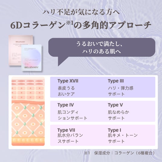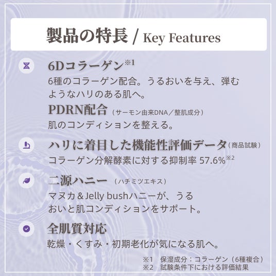 6Dコラーゲン、PDRN、二源ハニー(マヌカ&Jelly bushハニー)を配合した集中ケア用シートマスクです。乾燥、くすみ、年齢に応じた肌悩みが気になる肌に、うるおいとハリ感を与える設計です。シート素材には旭化成ベンリーゼ(R)アイスフェザーを採用し、優れた吸液性・保液性、軽薄・通気・高密着、生分解性・低刺激といった特長を備えています。<コラーゲン分解酵素抑制率57.6%>