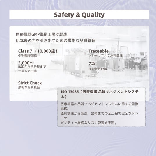 – 日本初※のISO13485準拠品質基準とClass7(10,000級)GMP基準クリーンルーム製造品質基準にはISO13485準拠品質基準を採用し、製造はClass7(10,000級)GMP基準クリーンルームで行っています。トレーサビリティや衛生管理にも配慮し、品質面からもデリケートな肌に向き合う製品づくりを進めています。