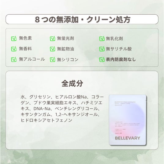 無色素・無香料・無鉱物油・無アルコール・無パラペン・無シリコン・無紫外線吸収剤・無石油系界面活性剤・動物性原料不使用