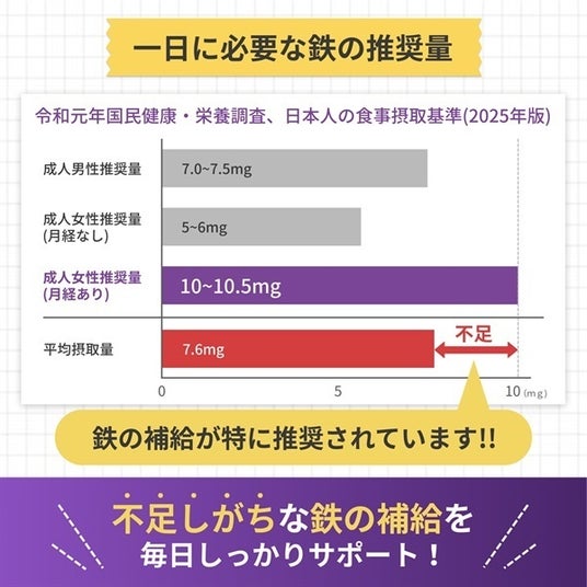 現代の日本人の鉄の平均摂取量は「7.6mg」にとどまっており、特に成人女性(月経あり)において大きく不足している現状があります。