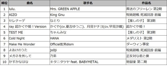 アニソン界のトップランナーとして八面六臂の活躍を見せ続けているオーイシマサヨシ「ニンゲン」、「GA-TAN GO-TON」のスマッシュヒット以降アニソン・アーティストとして頭角を現し始めた中島怜「おきらくぜ~しょん」など、HANAや星街すいせいといった常に耳目を集める新進気鋭のアーティストたちもひしめく中で“これぞアニソン”な楽曲で大健闘していることも改めて特筆しておきたい。アニソン・シーンがJ-POPの主戦場と化す中で、改めて“歌いたくなる良いアニソンとは?”について考えさせられるランキングとなった。