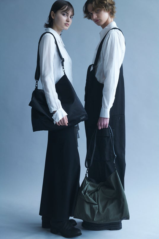 また、「INFINITE」「Unevenness」シリーズからも新たなナイロンバッグが登場。Yohji Yamamotoのコレクションにも用いられるポリエステルツイルを素材に採用し、中綿を加えることで従来のナイロンシリーズよりもふっくらとした質感に仕上げている。