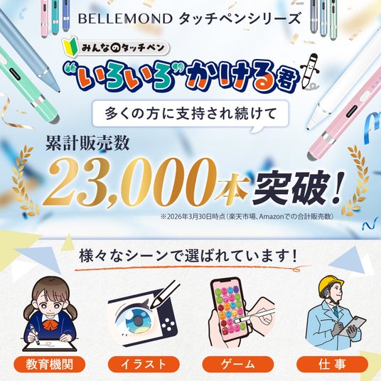 教育機関、イラスト、ゲーム、仕事など、幅広いシーンで活用されている『いろいろかける君』。楽天市場およびAmazonでの合計販売数は、2026年3月30日時点で23,000本を突破しました。