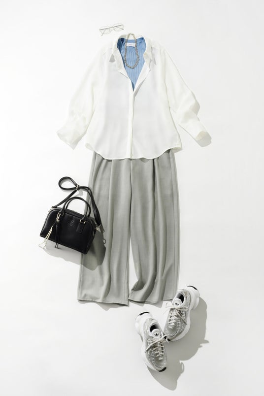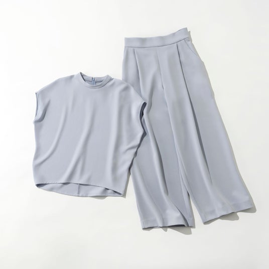 一枚でサマになるブラウスとシルエットが好評のワイドパンツの定番セット。スタイリング次第でオケージョンシーンも対応可能。