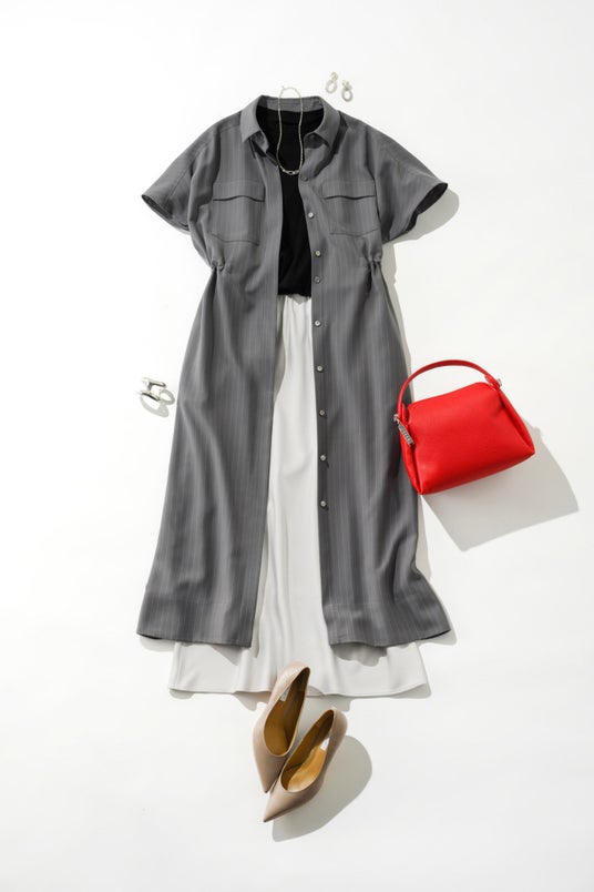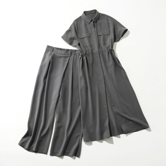 ロングシャツワンピース(GRAY/STRIPE)¥16,500 / COOL SMOOTH スタンドカラーカットソー(BLACK)¥7,150 / トリアセサテンロングスカート(L.GRAY)¥16,500