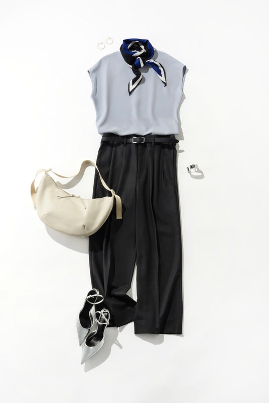 スタンドカラーコクーンブラウス(L.BLUE)¥12,100 / デニムライクタックワイドパンツ(BLACK)¥16,500 / シルク剣先スカーフ(BLUE)¥9,900 / ヴィーガンレザレットバックルベルト(D.NAVY)¥6,600