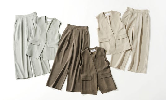 今回は、新年度のワードローブに取り入れたいおすすめの3種類(いずれも上下セット価格:税込30,800円 / 税抜28,000円)を、それぞれの豊富な着回しアイデアと共にご紹介します。