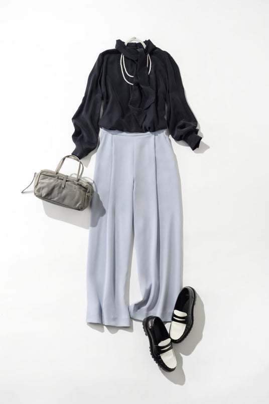 シルクボウタイブラウス(CHARCOAL NAVY) ¥23,100 / タックワイドパンツ(L.BLUE)¥18,700