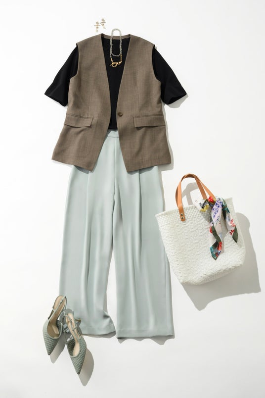 シワになりにくくお手入れも簡単なリネン風素材を使用。トレンド感のあるジレとワイドパンツのセット。
