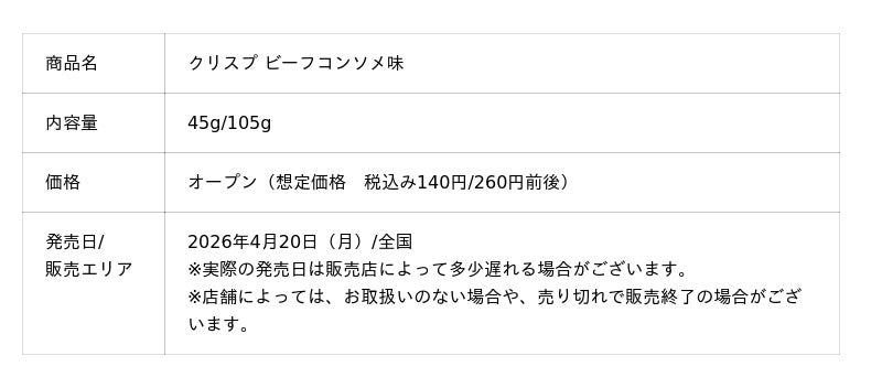 カルビー株式会社(本社:東京都千代田区、代表取締役社長兼CEO:江原 信)は、“ザクッ”とした食感が特長の成型ポテトチップス※1「クリスプ」から、肉のうま味をアップさせた『クリスプ ビーフコンソメ味』を2026年4月20日(月)から全国でリニューアル発売します。