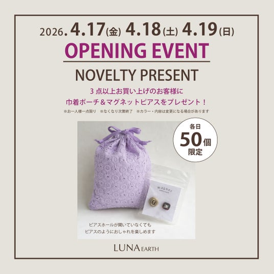 商品を3点以上お買い上げのお客様に、巾着ポーチ&マグネットピアスのセットをプレゼントいたします。