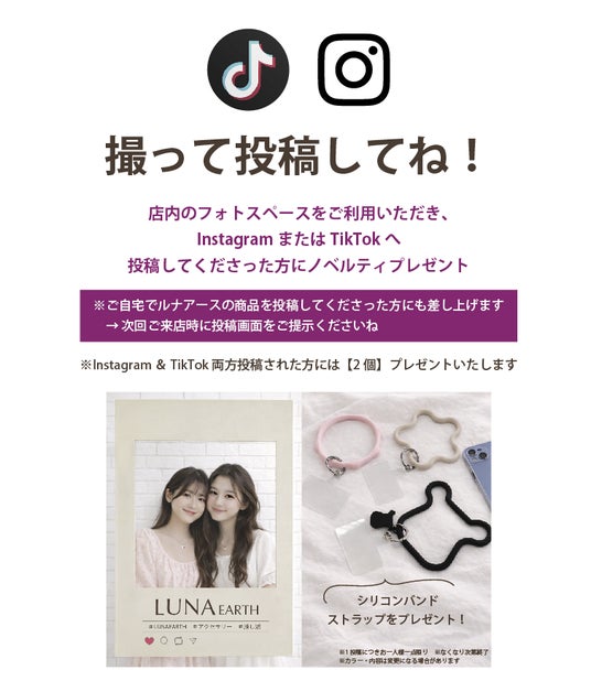 店内のフォトスペースをご利用いただき、撮影した写真や動画をInstagramまたはTikTokへ投稿いただいたお客様に、シリコンバンドストラップのノベルティをプレゼントいたします。