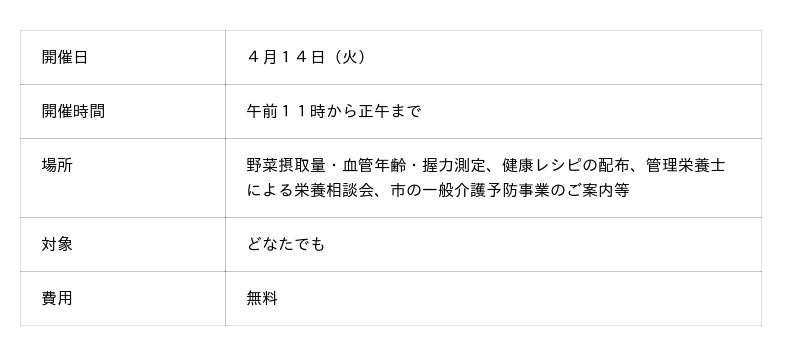 本イベントでは、マルエツの食育推進「いーとぴあ」が野菜摂取量や血管年齢の測定などを通じて、楽しみながらご自身の健康状態を知る機会をご提供いたします。また、管理栄養士による栄養相談会の実施や、川崎市と連携し健康づくりに役立つ情報の発信も行います。マルエツの移動スーパーが、お買物を楽しみながらご自身の健康や食生活を見直すきっかけづくり、またコミュニケーションの場となることを目指します。