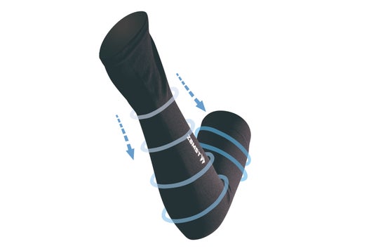 手首から上腕にかけて圧力を段階的に弱める設計で腕全体をサポート。また、腕全体を圧迫することで、疲労につながる筋肉の無駄な揺れを抑えます。