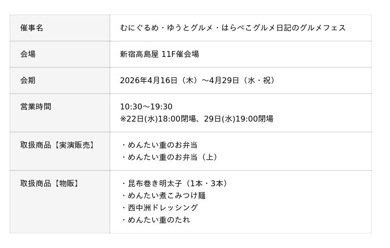 元祖博多めんたい重株式会社は、2026年4月16日(木)~29日(水・祝)新宿高島屋にて開催されるグルメイベント「むにぐるめ・ゆうとグルメ・はらぺこグルメ日記のグルメフェス」に出店いたします。