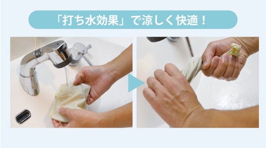 クーリング素材の生地を使用しているので、水で濡らしたり、自身から発する汗が蒸発する際の気化熱の働きで周囲の温度を下げることができます。