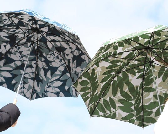 「雨の日も晴れの日も傘をさして外に出るのが楽しみになる傘をつくりたいと思いました。木漏れ日の中にいるような傘が最初の着想です。通常、傘は外側だけに柄があることが多いですが、Reverseシリーズは両面プリントなので、外側から見ても内側から見ても柄を楽しむことができるのが大きな特徴です。開発の際には、裏と表の両方の見え方を同時にデザインする必要があるので、テストプリントを持って外に出て、実際に日差しを受けた時の見え方や雨の日の見え方を検証していきました。イメージした色(指示色)と上がってきた試作品の色を見比べながら、光に透かしたときにもっとも美しく重なる色の濃淡にこだわりました。」(テキスタイルデザイナー氷室友里)