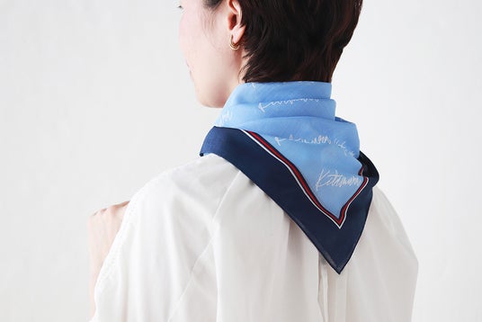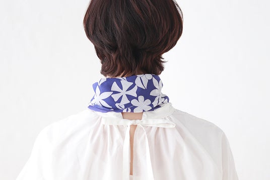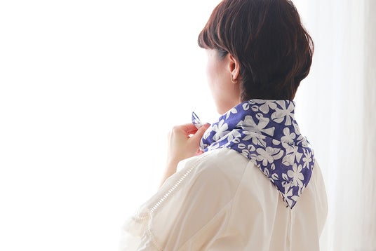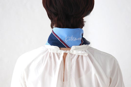 斜め半分に折って首に巻く仕様のため、ポケット部分は外から見えにくい設計。見た目はあくまで上品なネッカチーフのまま、自然に暑さ対策が可能です。