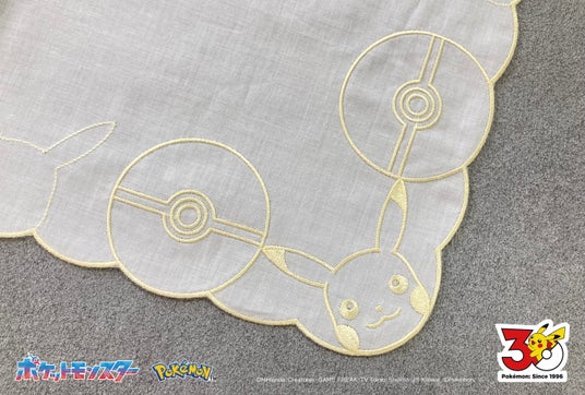 白いレースに、ピカチュウとモンスターボールをさりげなくデザインしたタオルハンカチ。タオル地には地色にやさしくなじむ色合いでピカチュウのワンポイント刺繍を施し、上品に仕上げました。