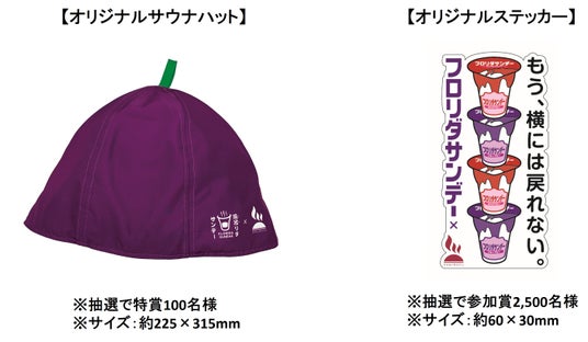 コラボ期間中は暖簾や内装がフロリダサンデー仕様になるほか、オリジナルサウナハット、オリジナルステッカーを抽選でプレゼントする企画も実施します。