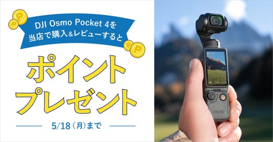 対象期間中にシステムファイブでOsmo Pocket 4を購入し、商品を実際にお使いいただいた感想を条件に沿ってレビューを投稿していただくと、採用時に次回のお買い物でご利用可能なポイントを最大3,000円分(3,000ポイント)プレゼントいたします。