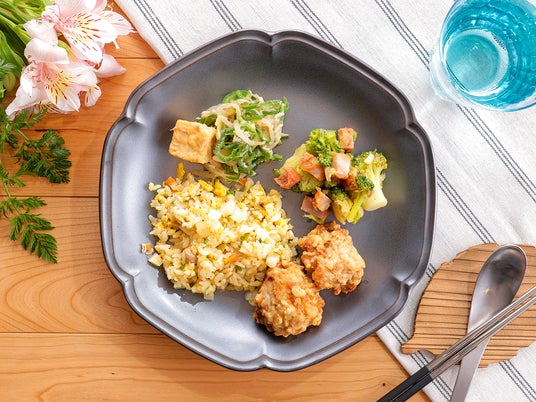 「ガッツリと中華を食べたいけれど糖質は控えたい」というお客様のお声に応え、満足感と軽やかさを両立させた一皿を開発しました。最大のこだわりは、人気の高い「炒飯」と「から揚げ」の組み合わせです。旨みを閉じ込めたジューシーなから揚げと、たけのこのシャキシャキ食感が際立つ本格的な炒飯が、お互いの美味しさを何倍にも引き立て合います。副菜には、オイスターマヨ風味のもやしと絹揚げや焼豚の旨みが溶け込んだブロッコリーを合わせ、味わいや食感に変化を持たせました。ボリューム満点でありながら、最後まで罪悪感なくお楽しみいただける計算し尽くされた中華プレートをご堪能ください。