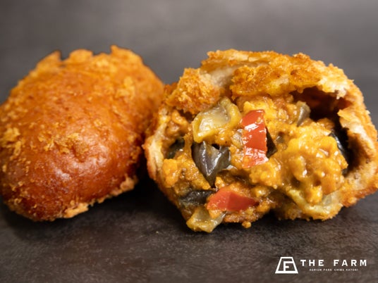 THE FARM BASEでは限定メニューとして、「THE FARMの本気カレーパン」を提供します。ご注文ごとに揚げるスタイルで、できたてならではの香ばしさとサクッとした食感を楽しめるのが特長です。中には野菜がごろっと入り、食べ応えのある一品に仕上げています。さらに、焼きたてクロワッサンや玄米パンをはじめ、約10種類もの焼きたてパンをご提供します。