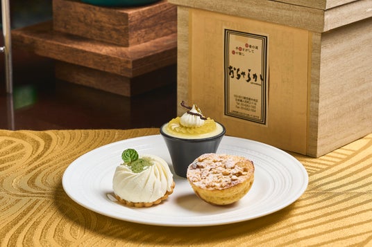 かねてより日本茶に深い関心を寄せ、日々の習慣として毎朝緑茶を楽しんできたエグゼクティブペストリーシェフ フレデリック・モロー。今回の日本茶とスイーツのコラボレーションは、彼にとって自然と創作意欲がかき立てられる、心惹かれる取り組みとなりました。「カシス風味の紅茶ゼリー ライト煎茶ムース」は、「うれしの玉緑茶」などを使用したなめらかなムースに、煎茶の味わいに寄り添いながら、カシスフレーバーのお茶で仕上げたゼリーを重ねた一品。日本茶の新たな可能性を追求する「おちゃらか」と、シェフ フレデリックならではのコラボレーションスイーツです。また、“焙煎”という共通点にシェフ フレデリックが着目し、その魅力に気づいたことから生まれた、ほうじ茶とチョコレートのマリアージュも魅力のひとつです。ミルクチョコレートにほうじ茶を練り込み、さらにほうじ茶とチョコレートを合わせたスポンジでサンドしました。仕上げに、香ばしいほうじ茶の風味を生かしたほうじ茶シャンティーをあしらった「ココアニブジュレ ほうじ茶ダークチョコレートクリーム」はシェフが特におすすめする一品です。