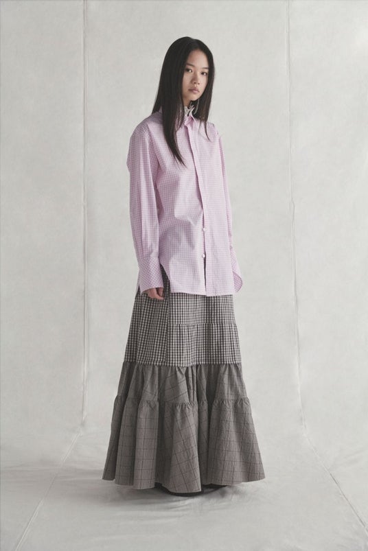 直線的なシルエットにレースで控えめな甘さを添えたギンガムチェックのブラウスや、 異なるチェック柄を組み合わせたボリュームのあるスカート。