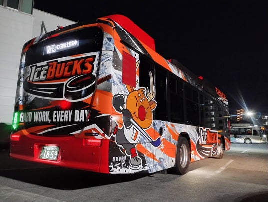 アイスバックスのロゴやマスコットキャラクターのしかっちがデザインされた車両が走行します。