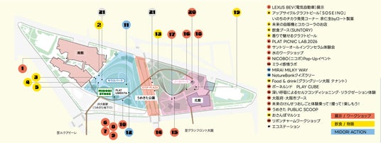グラングリーン大阪の様々な場所で、「世界にいいこと」に触れることができる多様性に溢れた体験をご用意しております。MIDORIパートナー企業が中心となって、飲食、ワークショップなど、参加者が楽しみながらココロやカラダの健康と充実が得られるアクティビティを提供いたします。