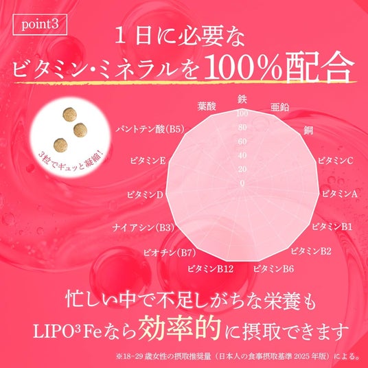 鉄分が体内で十分に活用されるためには、葉酸をはじめとする各種ビタミン・ミネラルの働きが不可欠です。そこでLIPO³ Feは、鉄分を始めとして、12種のビタミンと3種のミネラル(鉄、銅、亜鉛)を1日分100%配合(※)。鉄分をきちんと活用しながら、忙しい中で不足しがちな栄養も効率的に摂取できます。