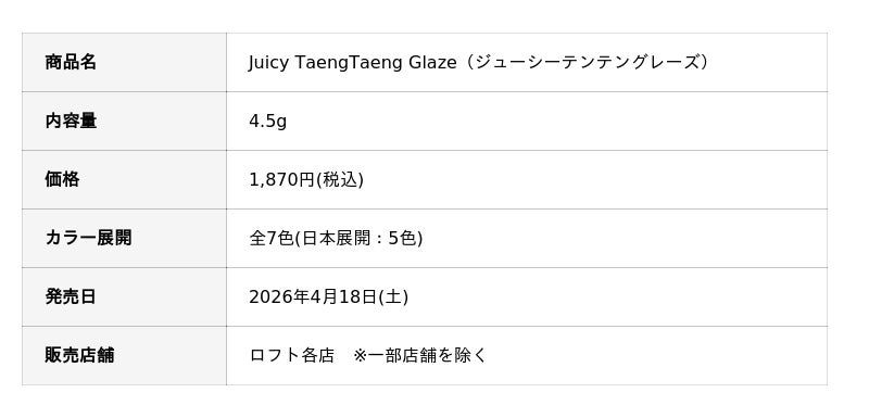 その注目アイテムであるリップグロス「Juicy TaengTaeng Glaze(ジューシーテンテングレーズ)」が、2026年4月18日(土)よりロフト各店 ※一部店舗を除く にて、日本初上陸・先行発売いたします。