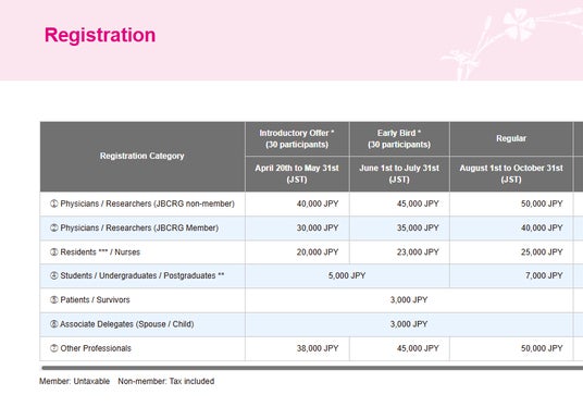 参加登録は公式サイト内の登録ページより受け付けます。また、JBCRG会員には特別割引が適用されます。