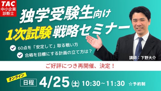 中小企業診断士試験対策講座を展開しているTAC株式会社(東京都千代田区)は、4/25(土)10:30より独学者向けに「1次試験直前対策」に関する無料オンラインセミナーを開催します。