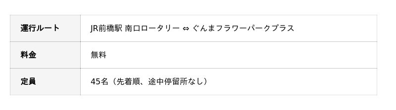 JR前橋駅南口ロータリーとぐんまフラワーパークプラスを約40分で結ぶ、予約不要・無料でご利用いただける直行バスです 。