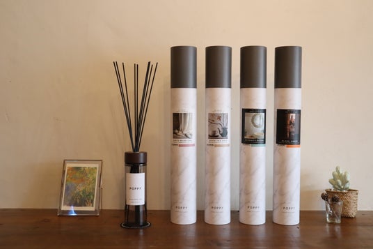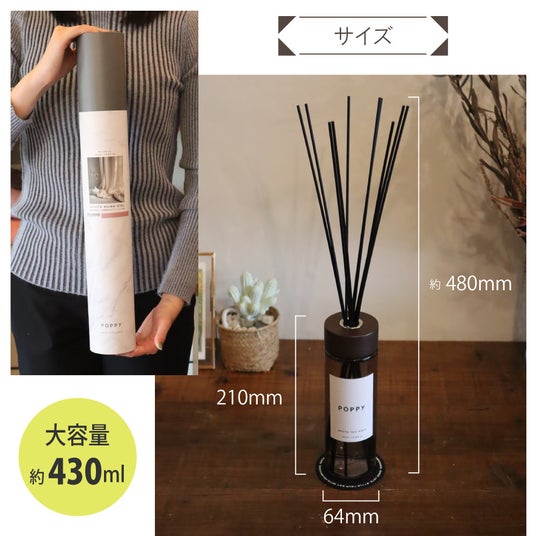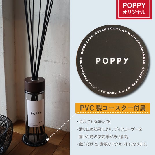 ポピーリードディフューザー大容量430ml入りで約6ヶ月間香りが持続する設計となっており、長く香りをお楽しみいただけます。さらに、オリジナルのPVC製コースターが付属しています。