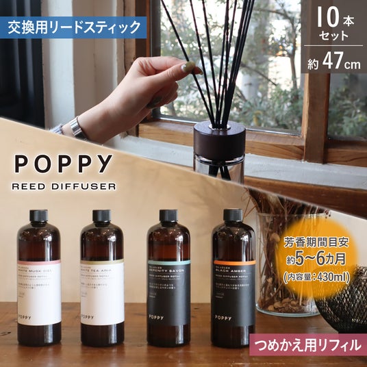 ポピーリードディフューザー専用の詰め替え用リフィルです。本体ボトルに詰め替えて使用することで、お気に入りの香りを継続してお楽しみいただけます。