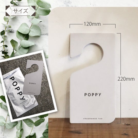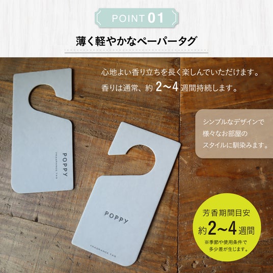 ポピーフレグランスタグ紙製の手軽な芳香アイテムで、クローゼットや玄関などお好みの場所に吊り下げて使用できるハンガータイプのフレグランスです。お好きな場所で気軽に香りをお楽しみいただけます。
