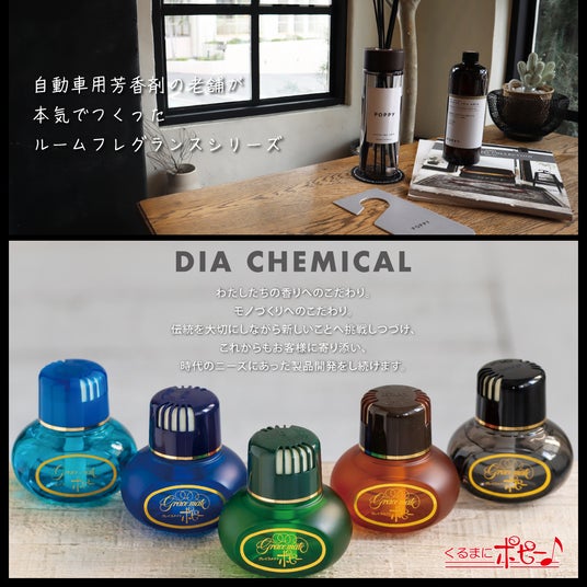 株式会社ダイヤケミカルは、1962年創業の自動車用芳香剤を中心とした製品を手がける老舗メーカーです。「くるまにポピー」のキャッチコピーで親しまれているロングセラー商品「グレイスメイトポピー」をはじめ、さまざまな商品を展開しています。