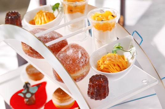 マンゴーやパッションフルーツを思わせる鮮やかな色彩、艶やかな質感、透けるようなグラスの涼感。ひと皿ごとに異なる表情が重なり合い、視覚からも“涼”を感じる構成で、それぞれが夏の光を受けて表情を変えるような、印象的な佇まいも魅力です。セイボリーには、鮮やかな色合いが目を引く夏色のモンブランをはじめ、キャヴィアを添えたヴルーテや、魚介と野菜を彩り豊かに仕上げた一皿、シグネチャーのサンドイッチなどをご用意。軽やかさの中にも満足感のある味わいに仕立てています。陽光煌めく夏の日に、果実の色彩とともに過ごすひととき。光と果実が織りなす、夏だけの余韻が広がります。
