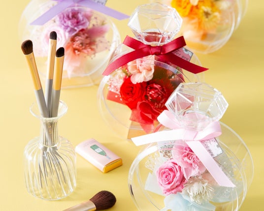 ダイヤモンドカットの美しいデザインを施した、割れにくい素材の器を使用した花束アレンジ。〈パレフローラ〉 プリザーブドフラワー ダイヤモンドパフューム(約10.8×6.0×高さ14.5cm/レッド・ピンク・オレンジ・パープル)各6,600円 ■7階 インテリアアクセサリー