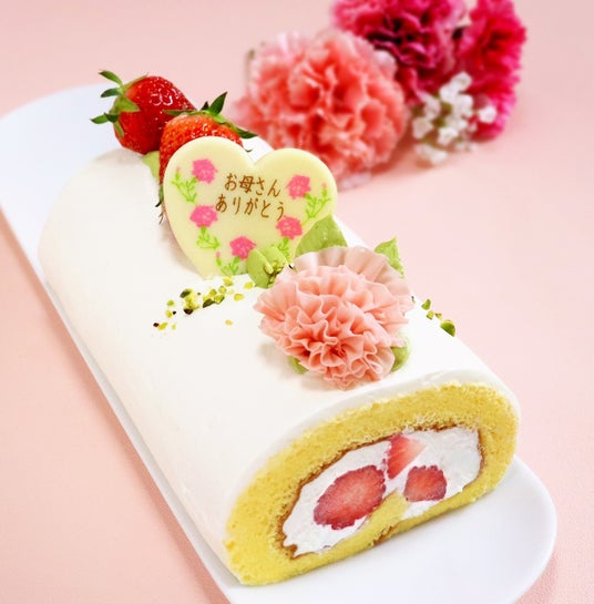 「新潟県胎内産コシヒカリ100%」の米粉の生地で完熟苺と生クリームを一緒に巻き上げ表面も生クリームで仕上げました。 〈五感〉母の日のカーネーションルーロ(約18cm)2,592円※5月8日(金)~10日(日)の販売 ■ご予約期間:5月9日(土)まで ■地下1階 洋菓子売場