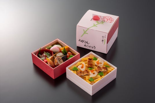 赤魚の西京焼や出汁の風味豊かな湯葉、海老の煮物といった様々な料理に蟹ほぐし身を盛りつけた鮮やかなちらし寿司。〈なだ万厨房〉母の日御膳(1折)3,240円 ※5月8日(金)~10日(日)の販売 ■ご予約期間:各日お渡し日の4日前まで ■地下1階 惣菜売場