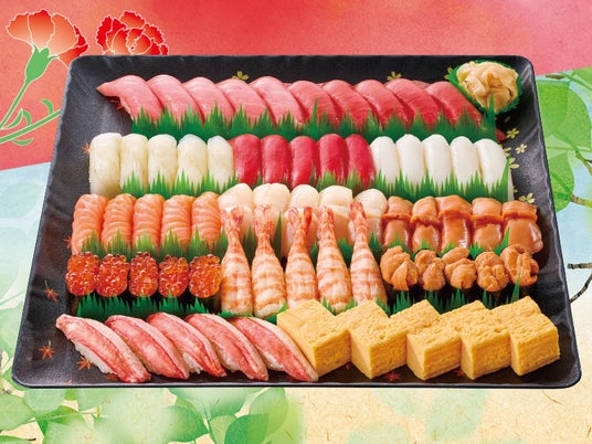 また、母の日限定メニューとして5月9日(土)・10日(日)の2日間限定で、うにやずわいがになどの豪華なネタを盛り込んだ「感謝(かんしゃ)」も販売いたします。こちらの商品も5人前・3人前・1人前がございます。