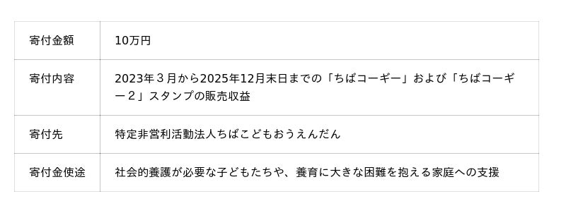 当行は、お客さまをはじめとした、幅広いステークホルダーのみなさまに親しみをもっていただけるよう、スタンプをご提供してまいりましたが、地域の子ども支援につなげたいとの思いから、2023年3月の提供開始から2025年12月末日までのスタンプ販売収益を寄付することとし、2026年4月21日(火)に寄付金贈呈式を開催いたしました。寄付金は、特定非営利活動法人ちばこどもおうえんだんを通じ、社会的養護が必要な子どもたちや、養育に大きな困難を抱える家庭への支援に役立てていただきます。