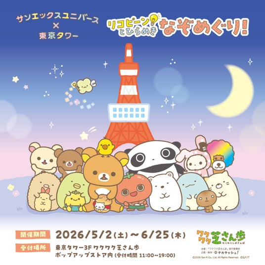 株式会社JTB BS事業本部 第二部事業部らで構成する「ワクワク芝さん歩」実行委員会は、サンエックスの人気キャラクターたちが東京タワーに集結する体験型イベント「サンエックスユニバース×東京タワー ワクワク芝さん歩」の開催に合わせ、「リラックマ」「すみっコぐらし」など約260アイテムのサンエックスユニバースグッズを販売するサンエックスユニバース ポップアップストアをオープンします。店頭では、東京タワーコラボ限定の描き下ろしグッズを約44点販売し、その一部となる13点を5月2日より先行発売します。また、キッチンカーで販売するオリジナル「トマトフード」など約4品、東京タワーや芝公園周辺を舞台とした全長約2km高低差150mの宝探しの詳細を下記の通り発表いたします。