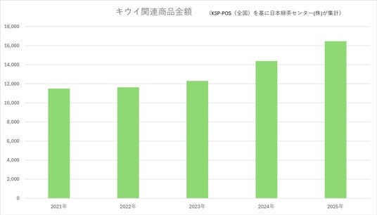 また、キウイはヘルシーでフレッシュなフレーバーと通年で出回っているのが特徴であり、人気は少しずつ拡大しており、関連商品はこの4年間で約1.4倍へ伸長しています。